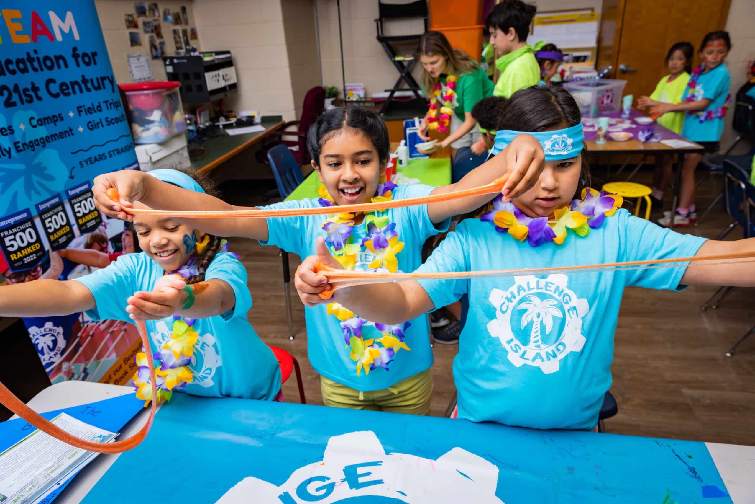 Slimetopia is an ooey, gooey, ONSITE, STEAM-based adventure that could have only come from the infinite imagination of the world’s #1 STEAM program. During each Slimetopia STEAM Camp by Challenge Island onsite field trip, afterschool class, or family-engagement event, we transform kids’ insatiable obsession with slime into teachable moments that broaden their horizons and fill them with wonder and glee. Our award-winning Slimetopia school programs stretch learning across the curriculum, striking a perfect balance of hands-on slimy fun and substantive standard-aligned lessons.